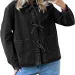 PLNOTME Womens Denim Jackets Casual Loose Fit Tie Front Tops Fashion Jean Coat with Pockets