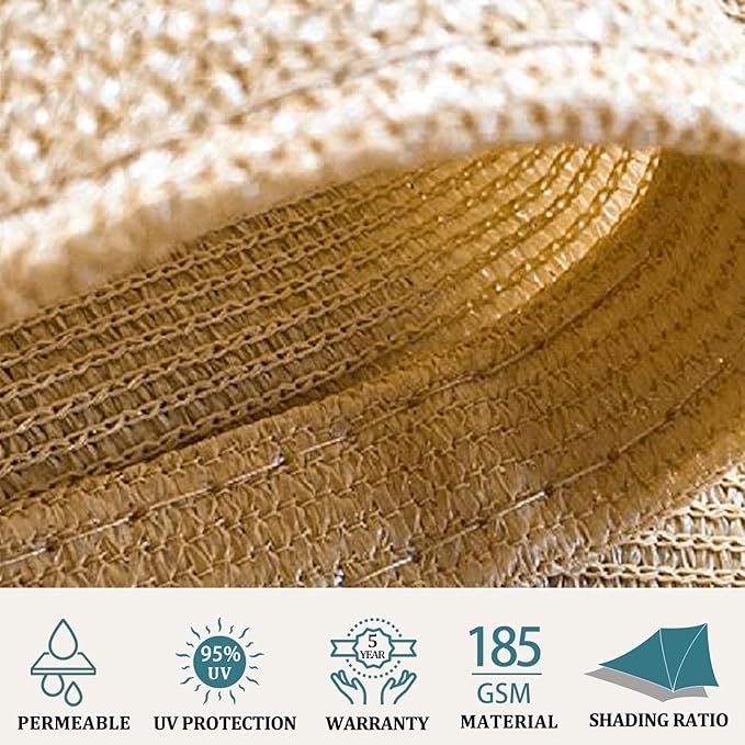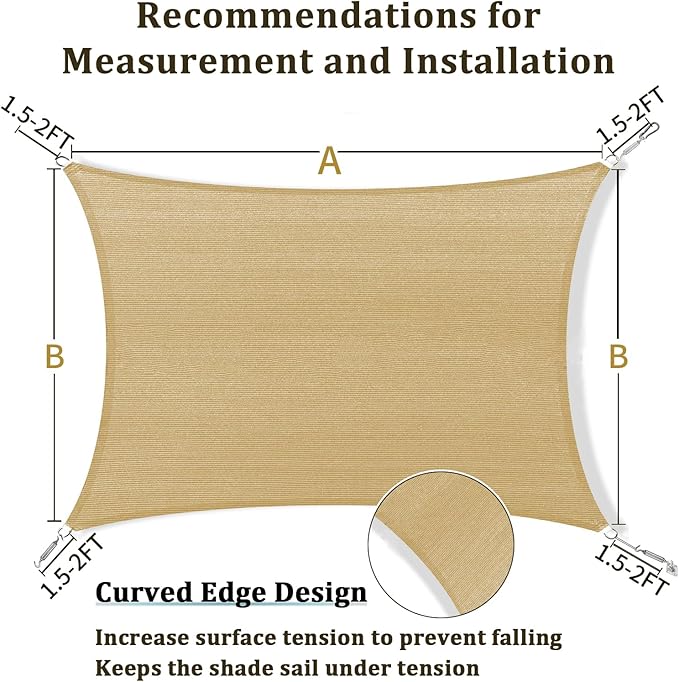Create Your Cool Oasis. Shield your outdoor spaces with our premium shade sail, expertly crafted from durable 185 gsm HDPE fabric. Enjoy up to 95% UV protection and significant sun blockage, creating a cooler, more comfortable environment for your patio, garden, or pool. The breathable weave ensures airflow, while reinforced seams and stainless steel D-rings guarantee lasting quality. Please note: This sail is designed for shade and is not waterproof. For optimal installation, measure from D-ring to D-ring and allow 1.5-2 feet for hardware. We recommend a sail size approximately 88% of your desired coverage area (AxB). The curved edges prevent water pooling, ensuring long-term durability. Enhance your outdoor living with exceptional shade and comfort.