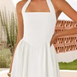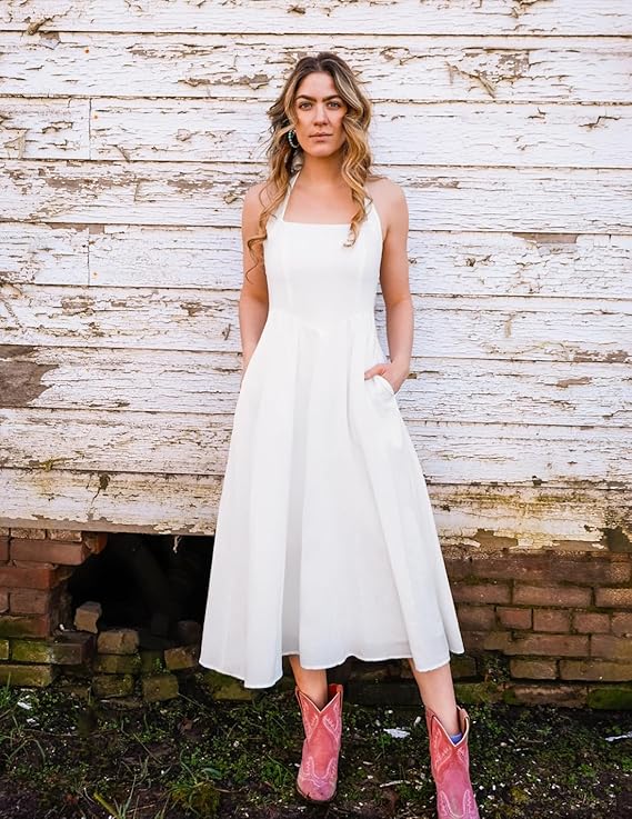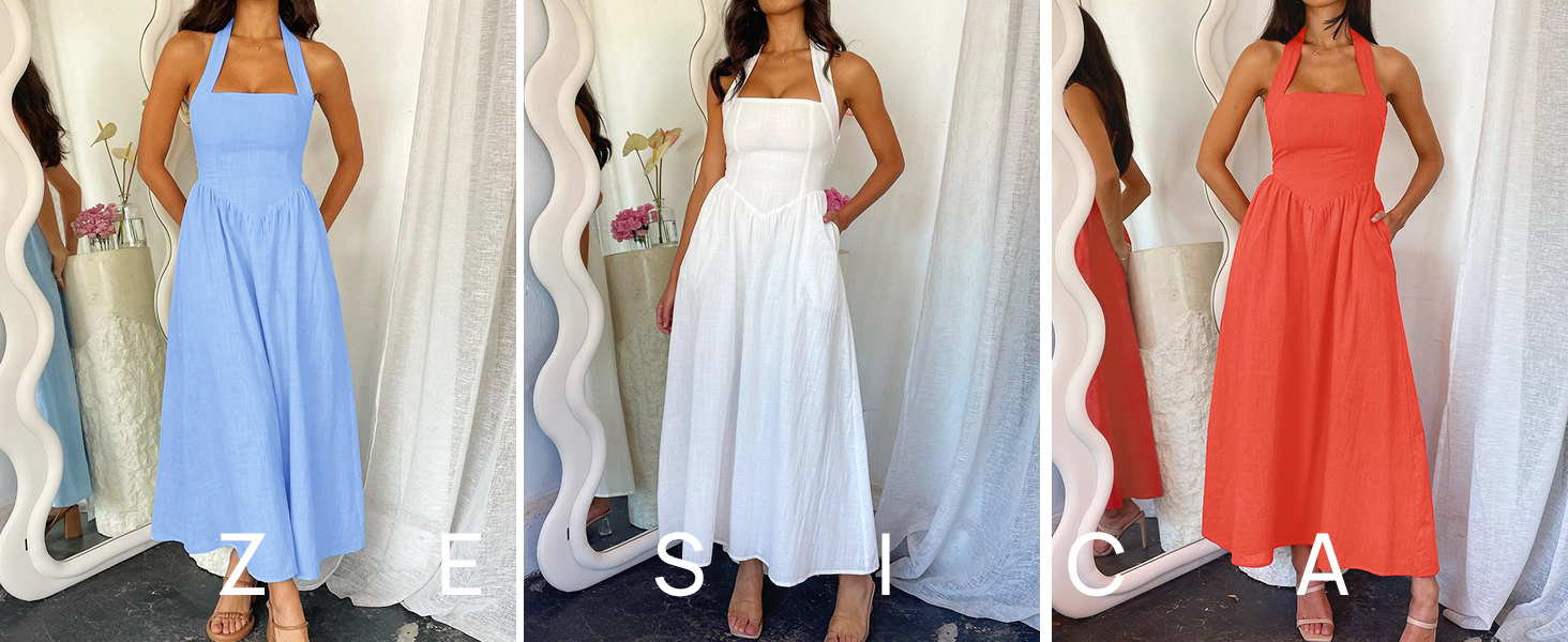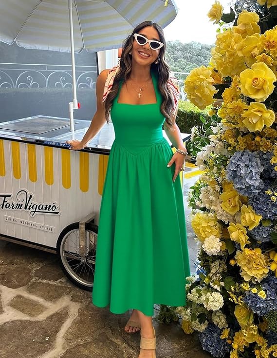 Embrace Effortless Summer Style with the ZESICA Halter Midi Dress. Step into summer 2025 with this chic sleeveless midi dress. Featuring a flattering halter neckline and the option to wear it off-shoulder, this dress offers versatile styling for any occasion. The high waistline accentuates your figure, while the swingy, flowy skirt ensures comfort and graceful movement. 1 Perfect as a beach cover-up or dressed up for an evening out, this long dress is a must-have for your warm-weather wardrobe. Â